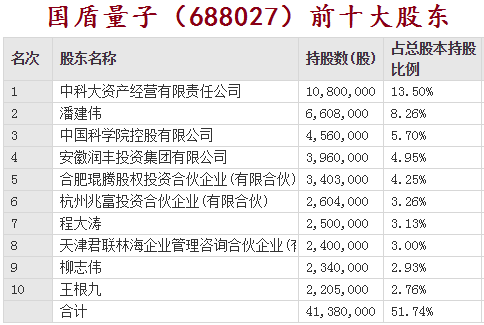 国盾量子的前十大股东的情况如下表所示。他们的股权都稀释了1/4。